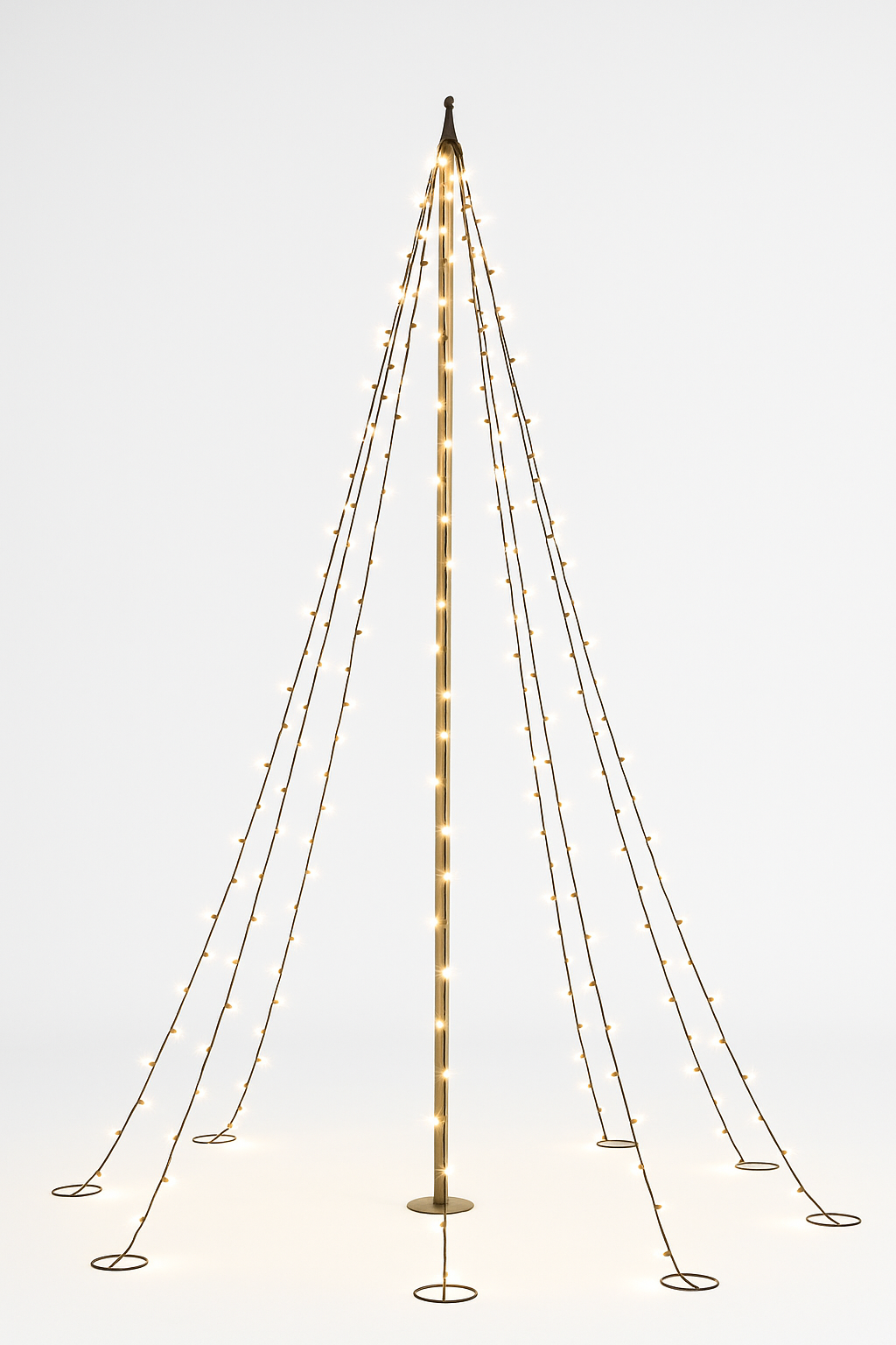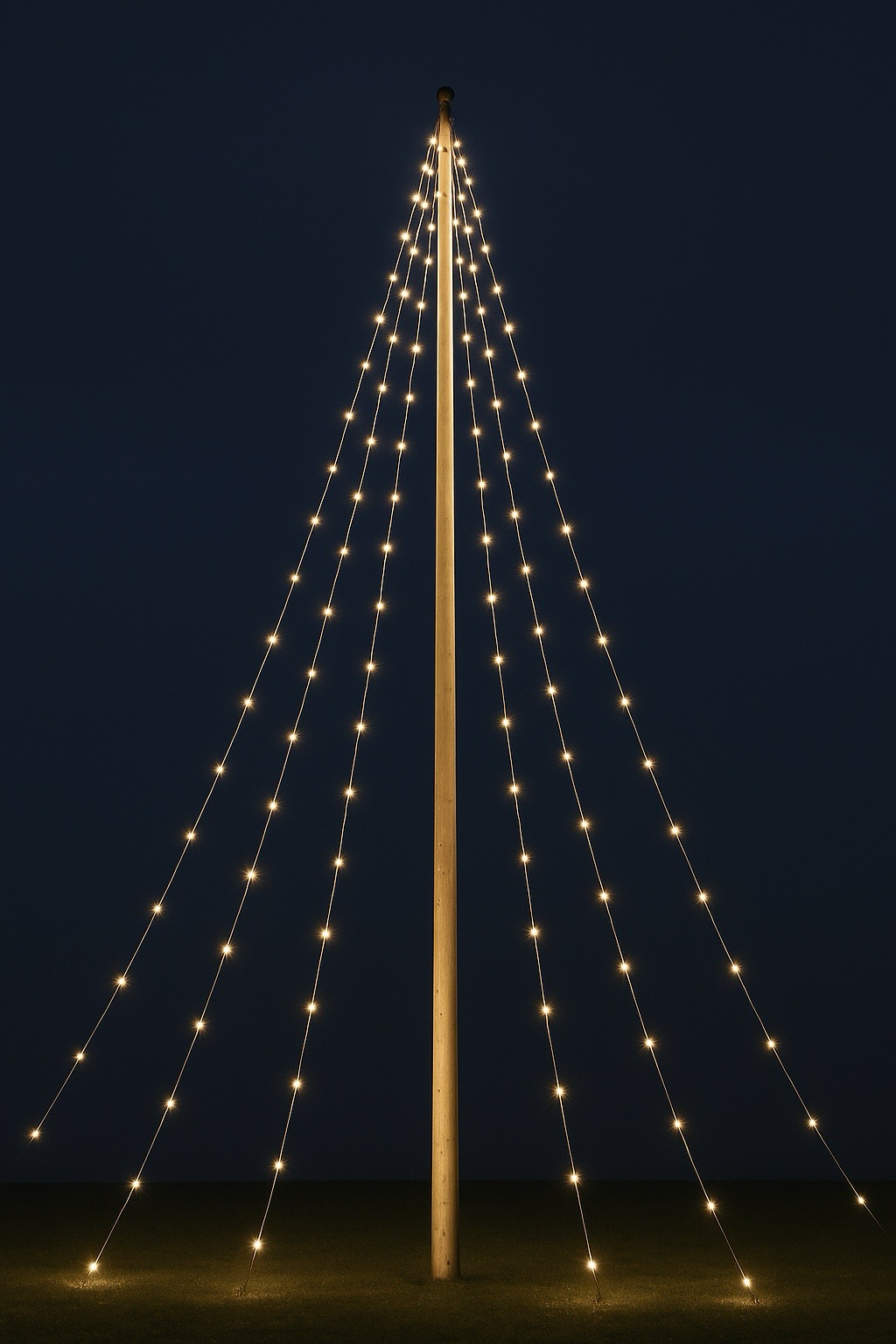 Kalėdinė stiebo girlianda – tai modernus ir itin estetiškas būdas sukurti įspūdingą šventinę nuotaiką jūsų kieme, sodyboje ar verslo aplinkoje. Girlianda tvirtinama prie vėliavos stiebo ir išskleidžiama kūgio forma, taip sukuriant elegantišką kalėdinio medžio efektą be jokio vargo.
